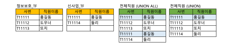 SQL 에서는 UNION ALL 로 2개의 테이블을 하나로 묶어서 조회하는게 가능하다.