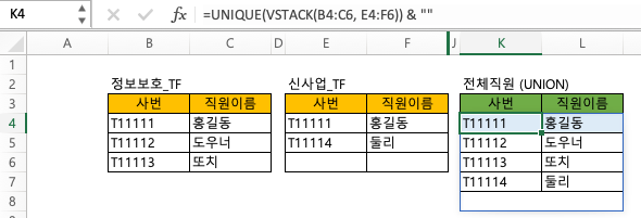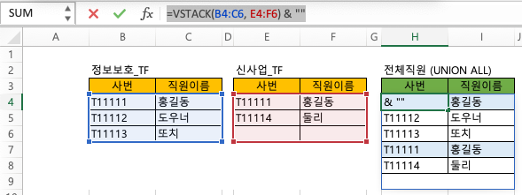 결론부터 말하면 VSTACK 함수를 써서 합칠수 있고, 중복된건 UNIQUE 함수를 쓰면 해결가능하다.