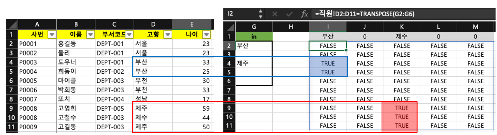 IN 검색범위의 시트범위를 TRANSPOSE 하면 세로 표현이 가로로 변경되고, 이때 검색조건을 넣게 되면 이에 따른 검색결과가 array 로 리턴된다. 즉, 동일한 열에 대한 일치데이터는 TRUE 값이 매칭되는데, 이 행에 대한 index 정보를 추출후 그값을 가져오는 방식이다.