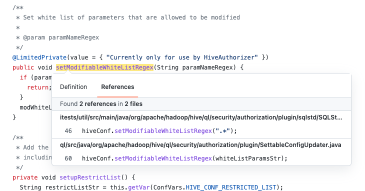 해당 오류메시지가 있는 코드를 찾아보면, 다음과 같이 HiveConf.java 에서 해당 조건에 만족하지 않을때 발생되는에러였다. 쉽게 생각하면 tez.queue.name 과 같이 실제 hive 에서 허용가능한 설정이 아닌경우 에러처리가 되고 있던것이다.