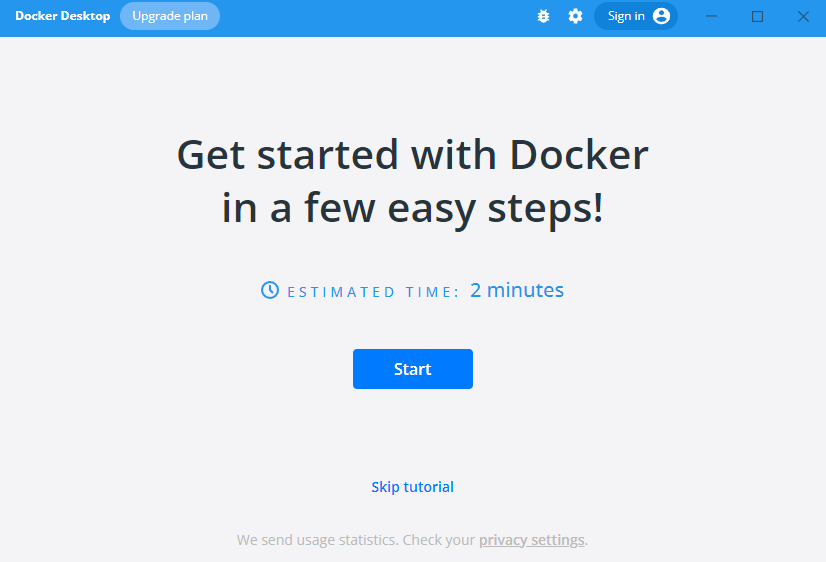WSL 패키지를 설치후 재기동해서, 도커 데스크탑을 확인해보면 stop 상태에서 running 상태로 바뀌고, 애플리케이션창에서도 튜토리얼을 해볼건지 확인하는 창이 뜬다. (이 상태여야 정상 실행가능)