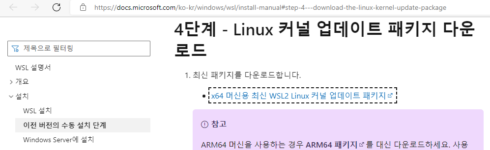 경고창에 보면 중간에 링크가 있는데, 그 링크를 클릭하면, 아래와 같이 WSL2 Linux 커널업데이트 패키지라는 프로그램 다운로드 링크가 보인다. 해당 프로그램을 다운로드 받아서 설치후 재기동 해야 한다.