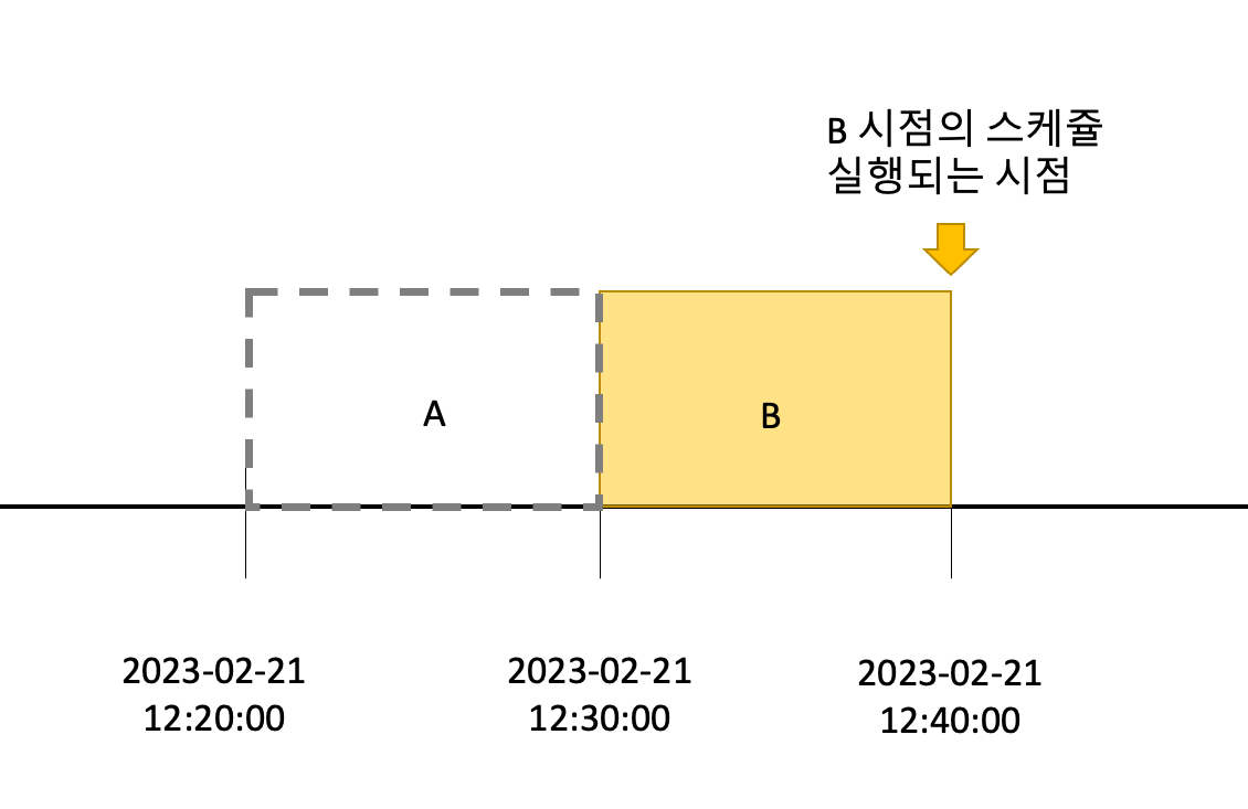 즉, 아래 그림에서 B 시점의 스케쥴은 사실 12:30 ~ 12:40 의 데이터 처리를 해야하기 때문에 12:40분에 실행되어야 하고,